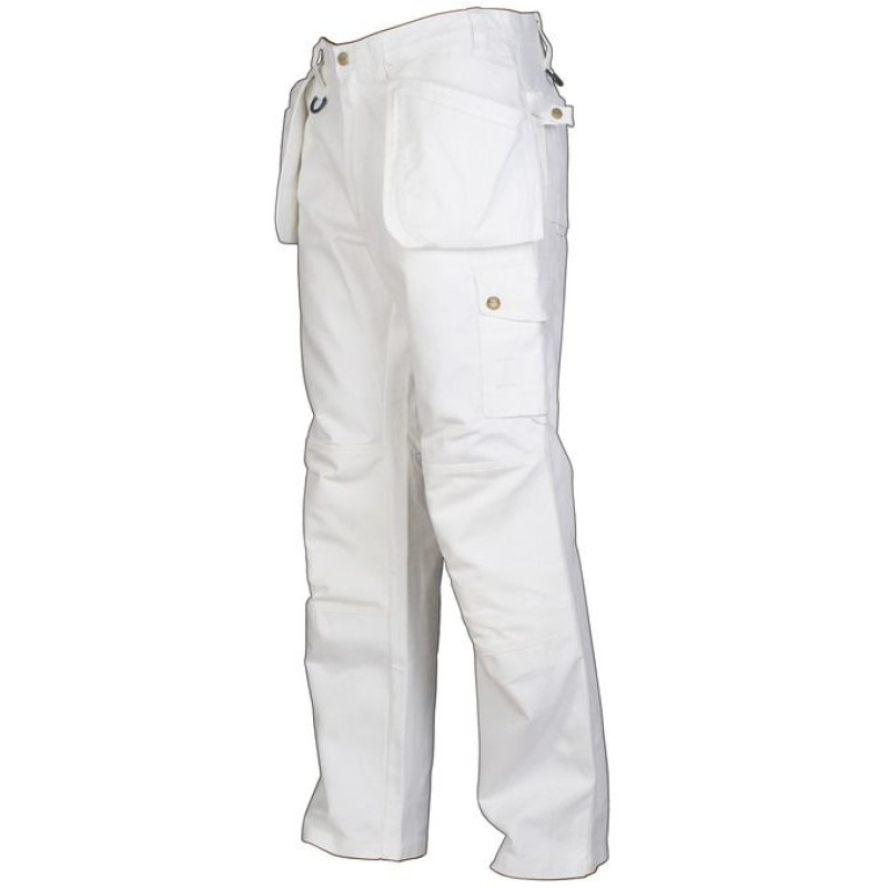 Två hängande, undanstoppningsbara spikfickor, med extra fickor varav en med verktygshällor. Spikfickorna är förstärkta med 100 % Cordura®. Djupa sidfickor med plats för hängfickorna. Två D-ringar. Två reglerbara hammarhankar. Benfickor med telefonficka, pennficka och verktygsficka. Tumstocksficka med verktygsficka och knivknapp. Knäskyddsfickor i Cordura®, öppning inifrån och reglerbar höjd av knäskydden. Förböjda knän. Förstärkt längst ner på baksidan av benen med Cordura®. Bakfickor med övervidd. Bakfickor och benfickor har hällor för Inbags.