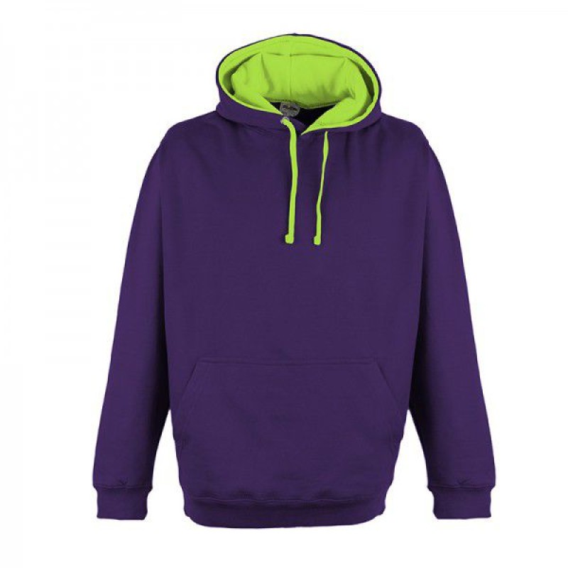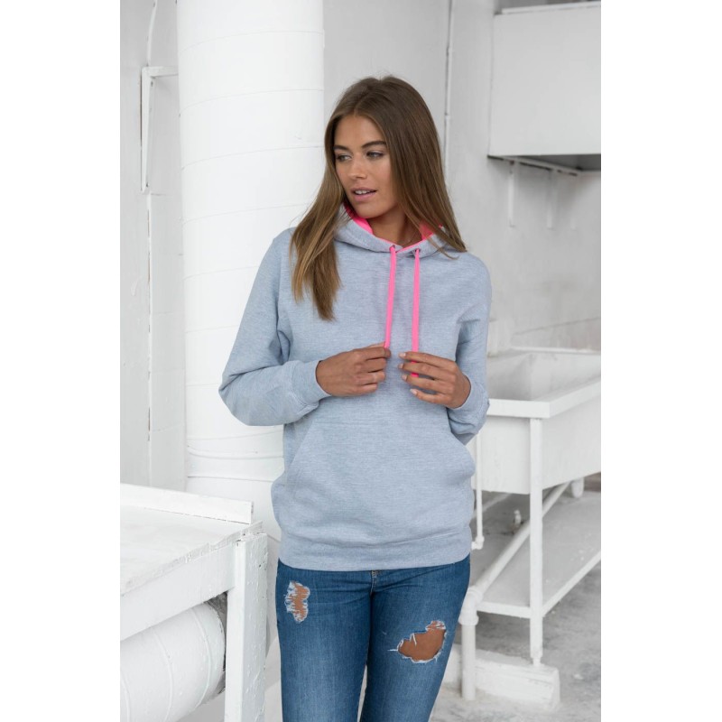 En huvtröja i kontrastfärgad luvsnara och innersida av luva med lysande stark färg. Samt gömda hörlursslingor i tröjan.